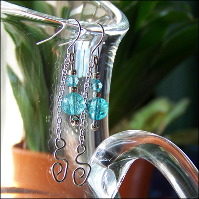 These sparkly little aqua beads are from the stash I treated myself to with some much-appreciated Christmas cash. The cracked glass is quickly becoming a favorite for me, so I can see myself splurging a little (eventually) to pick up a few more in different colors! I paired these with silver wire and silver chain, put together in an anything-goes sort of way.